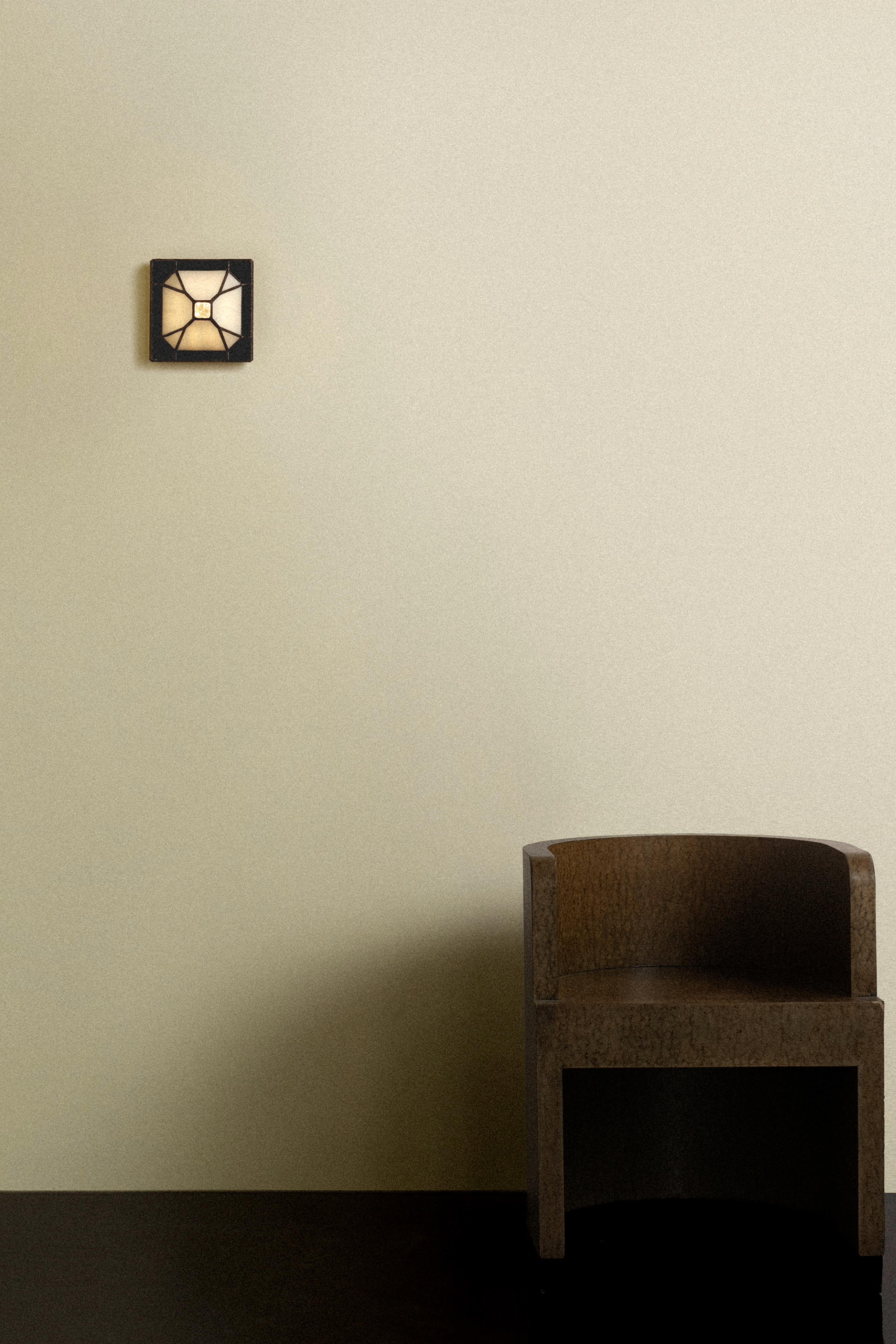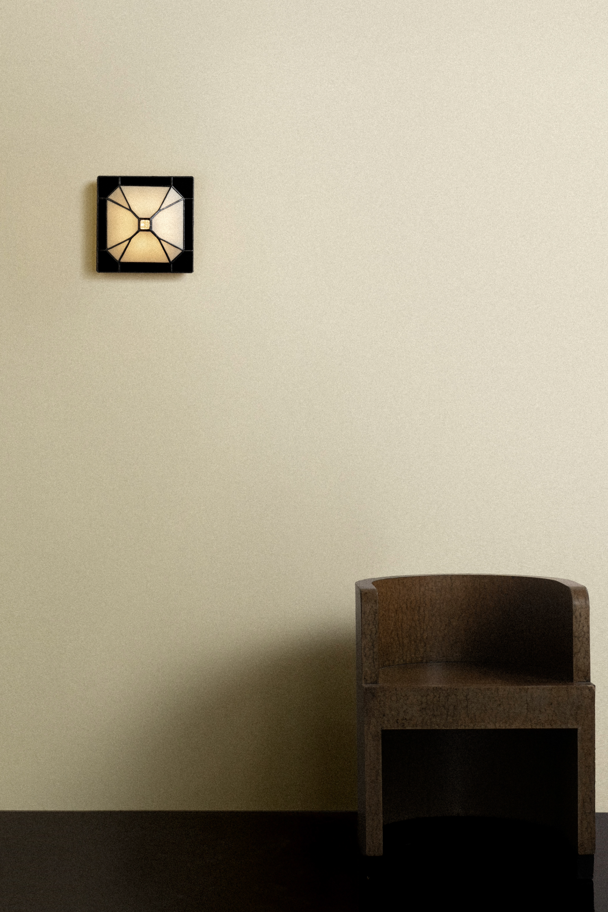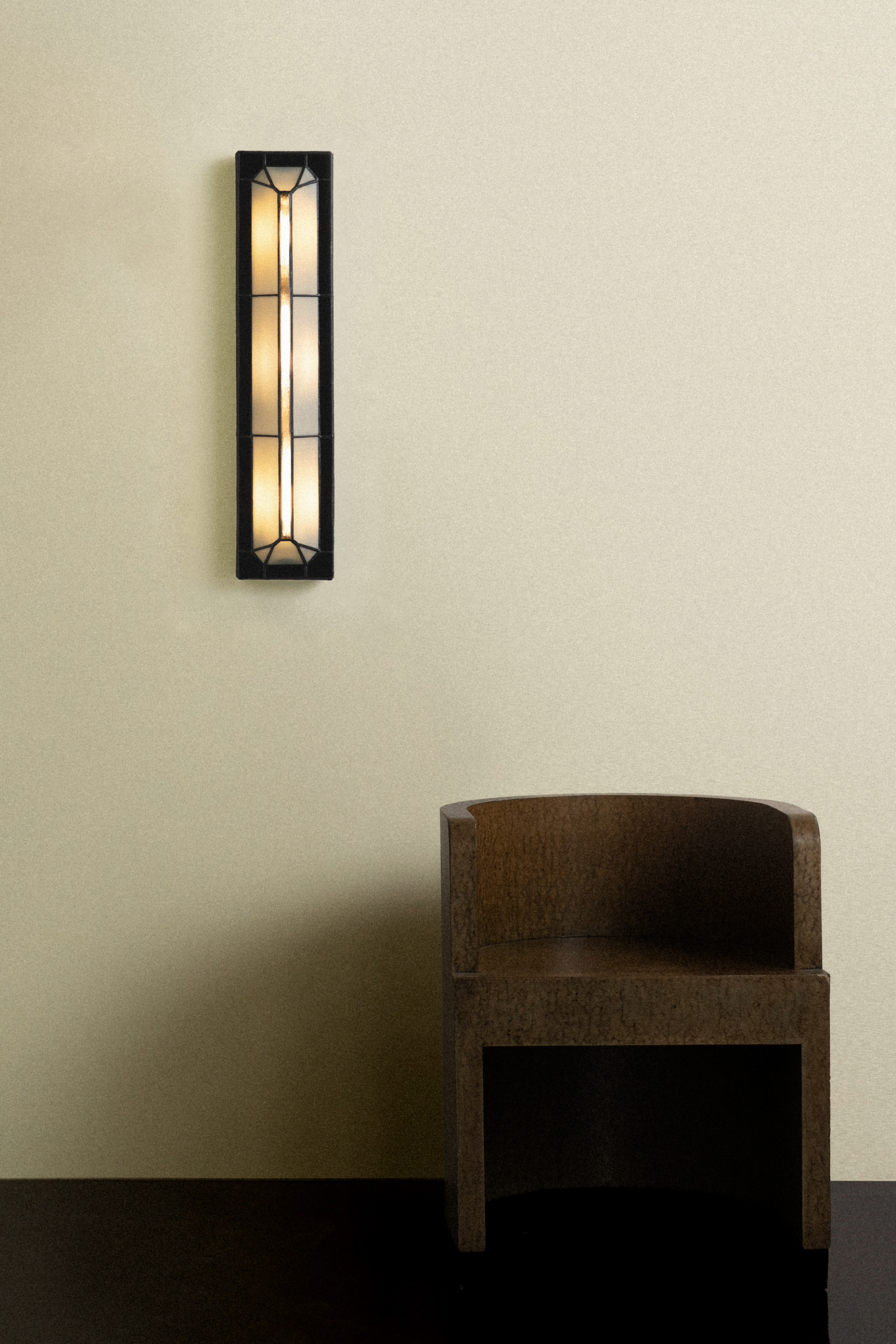Composed of hand-cut, opalescent glass, the faceted shade fans outward from a patinated black base, shaping a layered interplay of form and glow.